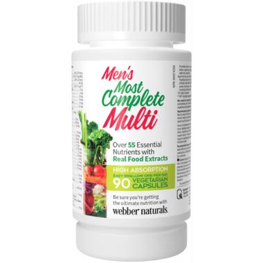 Webber Naturals Menโs Most Complete Multi is a one-per-day formula providing 100% of recommended vitamins and minerals in a whole-food base to maintain eyesight, skin, immune function, healthy bones, and muscle function for men under 50. Each easy-to-swallow capsule features over 55 nutrients from non-GMO sources, and is suitable for vegetarians.