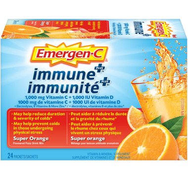 Each dose delivers 1,000 IU of vitamin D, 10 mg of zinc, and 1,000 mg of vitamin C, to help support immune function. Emergen-C Immune+ may help provide a modest reduction in duration and severity of colds when taken regularly, and it includes seven B vitamins to support energy production.